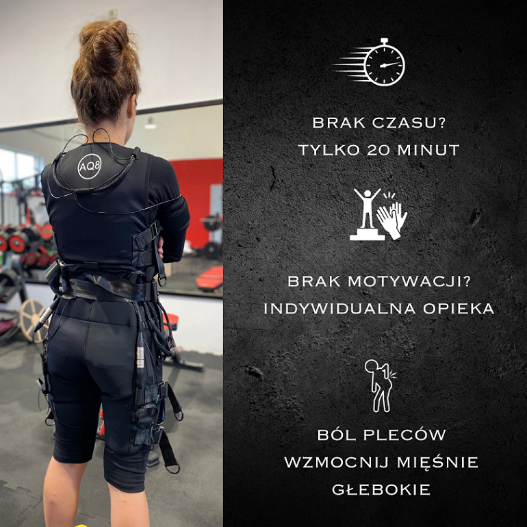 To innowacyjna metoda, która pozwala na intensywny trening całego ciała w krótkim czasie. Dzięki elektrostymulacji aktywujemy mięśnie głębokie, co zwiększa efektywność treningu, pomaga pozbyć się dolegliwości bólowych pleców i zastępuje 1,5h treningu tradycyjnego. Trening trwa zaledwie 20 minut, to idealne rozwiązanie dla osób, które mają mało czasu i chcą osiągnąć realne efekty. Nasze studio wyposażone jest w najnowszy bezprzewodowy sprzęt EMS, a treningi prowadzone są przez wykwalifikowanych specjalistów. Naszym dodatkowym atutem bezprzewodowego sprzętu są treningi na sali, na siłowni zewnętrznej oraz marsze i biegi w lesie.